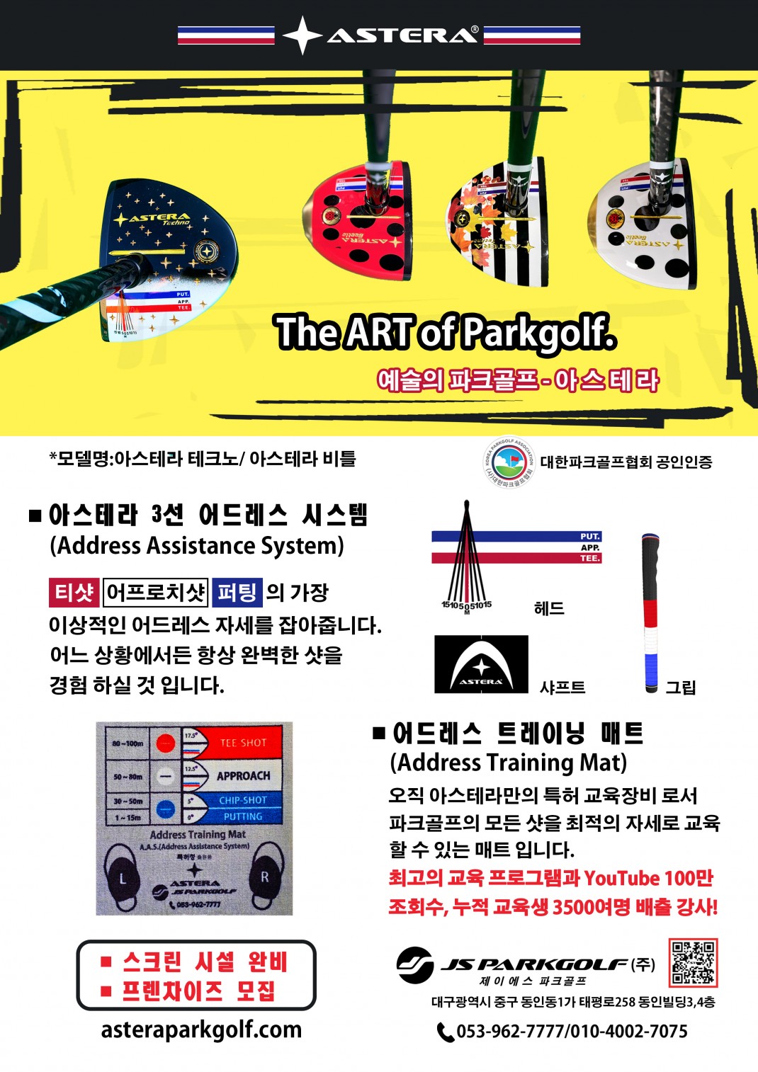 아스테라 뉴 잡지광고 이미지 작성자관리자 등록일 25-05-10 조회793회 본문 아스테라 5월 새롭게 업데이트 된 잡지광고 입니다. 3선 어드레스 특허기술과 어드레스 트레이닝 매트에 관한 내용 입니다. JS파크골프 교육생 김태복 씨-스크린 대회 3위 입상 아스테라 홍보선수단 5월 월례회 목록